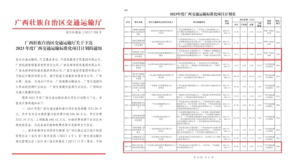 近日,广西交通运输厅下达2023年度广西交通运输标准化项目计划,由北投公路集团主持编写的《普通国省干线公路沥青路面施工技术规范》《公路波形钢腹板组合梁桥养护技术指南》和《国省干线公路工程风险辨识指南》3项标准获得批复立项。